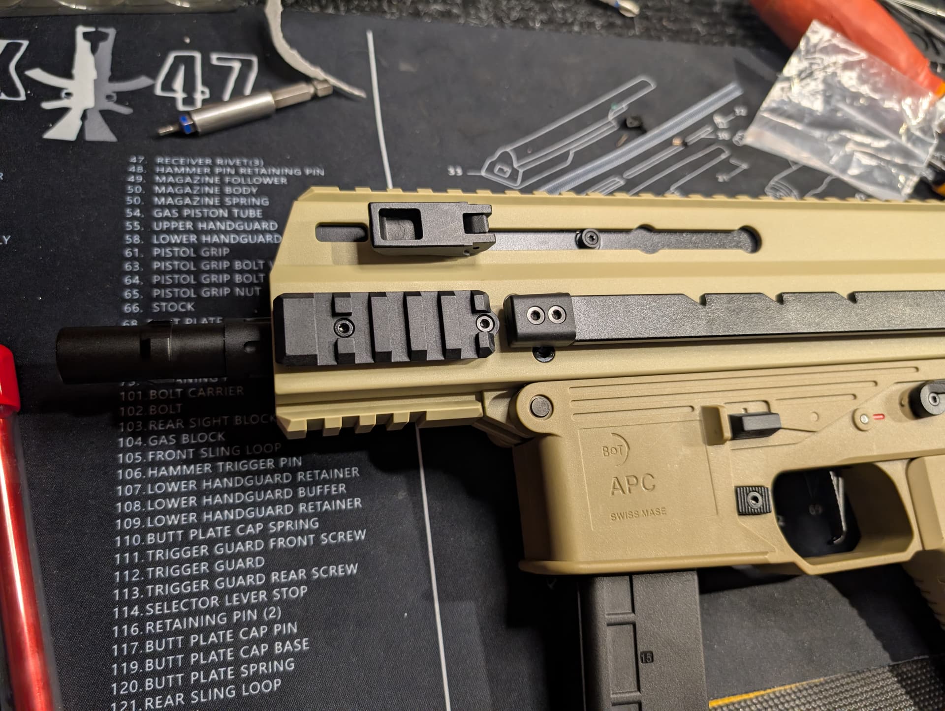 As for beemers APC… nozzle, piston and piston head, short stroked two teeth, hopup barrel. Done. With stock spring got 225fps. Standard was 220 so not bad, especially since the semi is a little snappier with short stroking. Efficienter-er!
