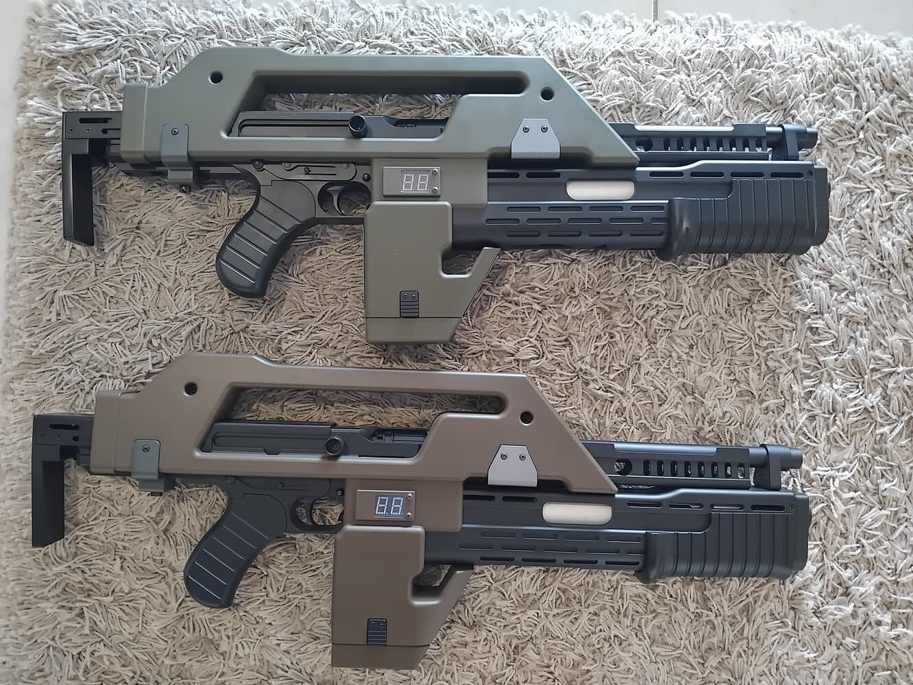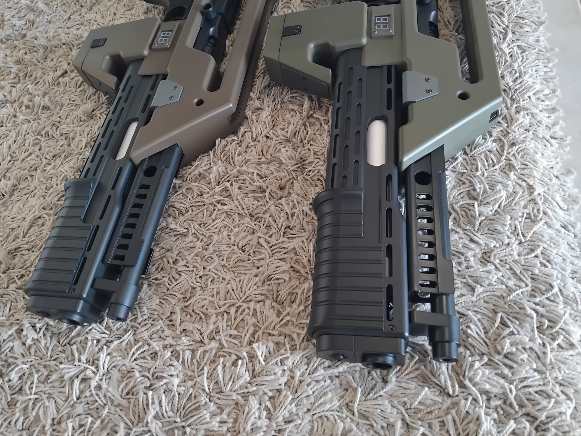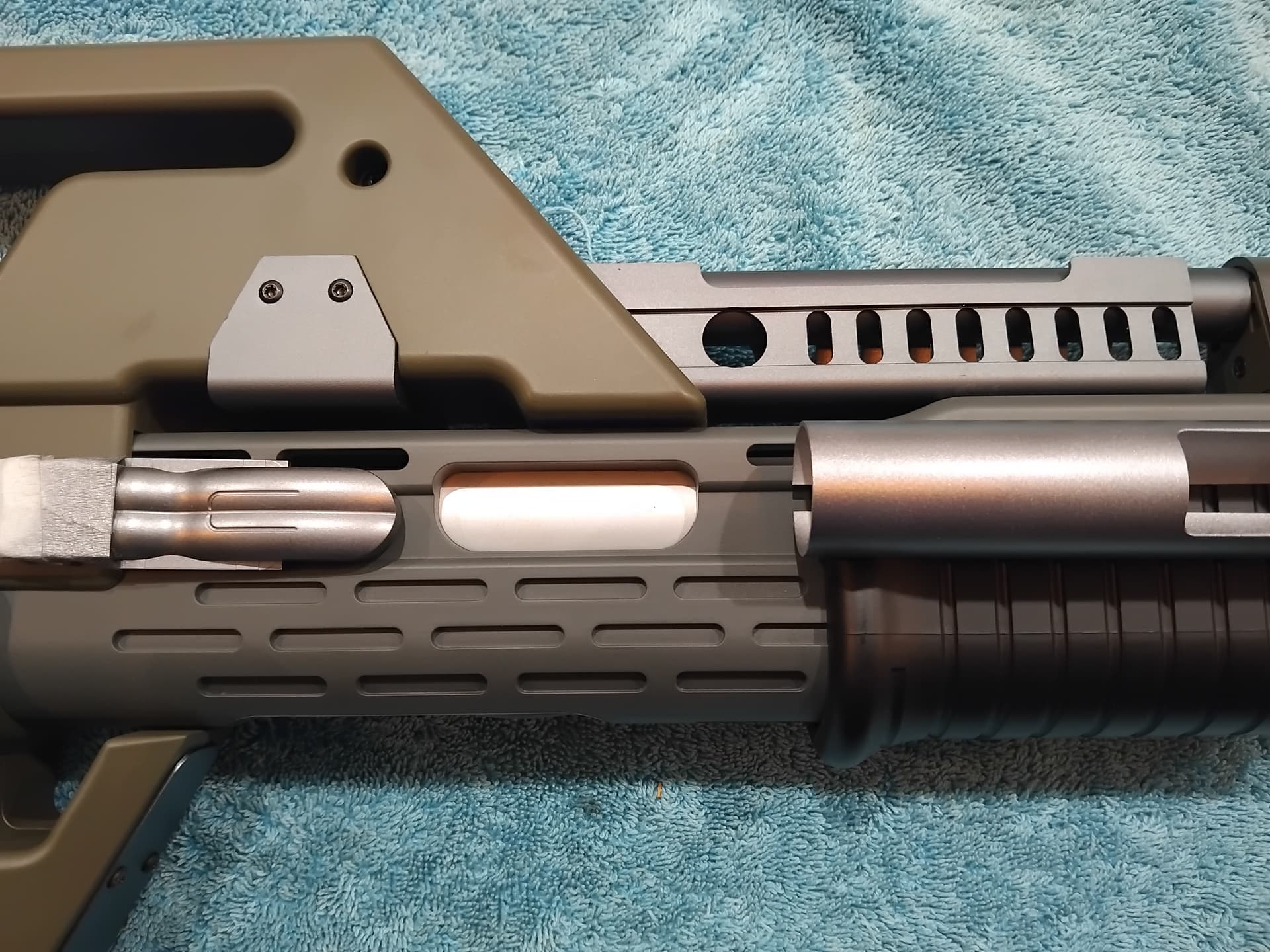 You can notice the extra gleam, on the barrel, barrel vent, and front grenade launcher barrel end cap…