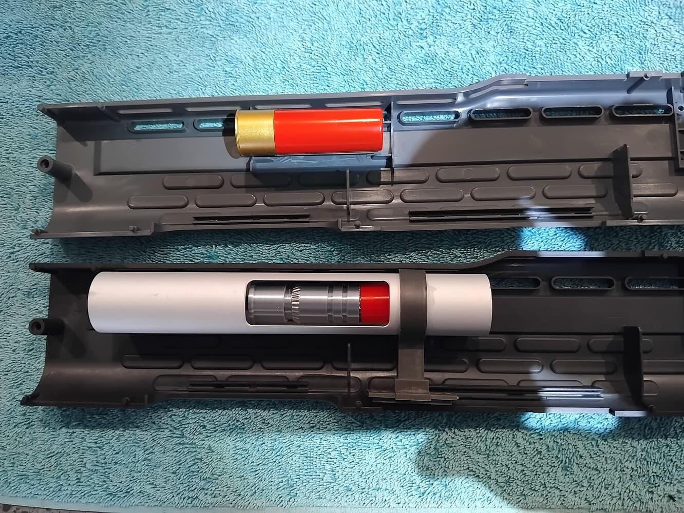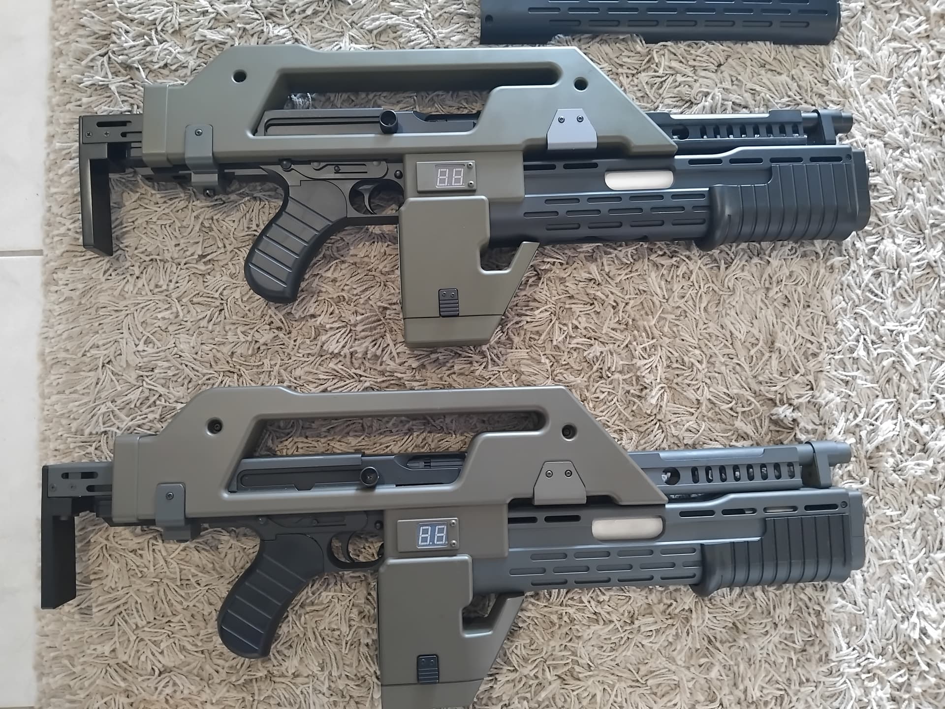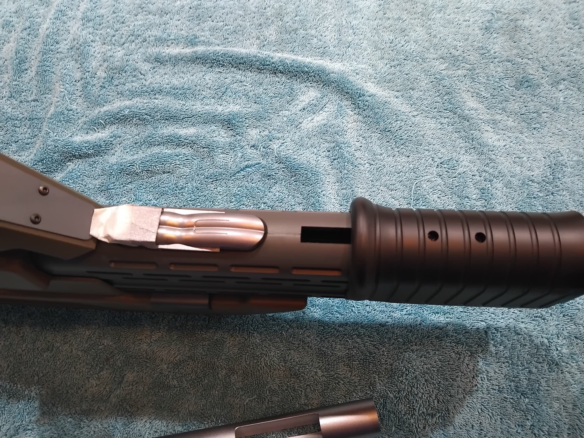 You can notice the extra gleam, on the barrel, barrel vent, and front grenade launcher barrel end cap…