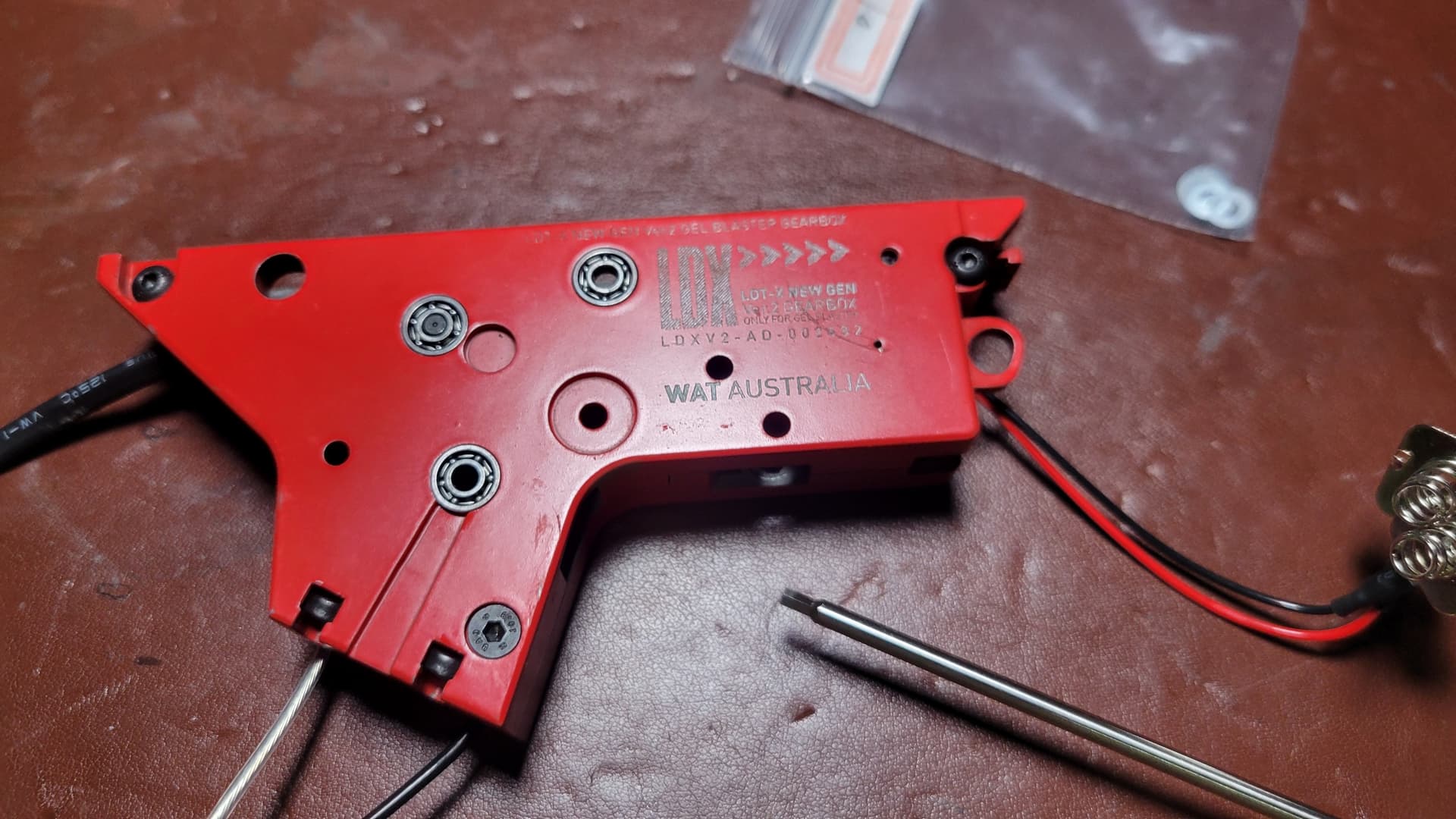 Now sporting solid bushes, 13:1 gears missing 3 teeth, M110 spring, AKgelblasterAU piston and piston head, alloy cylinder head and new nozzle, with a M150 “super motor”… Oh and a full rewire was needed.