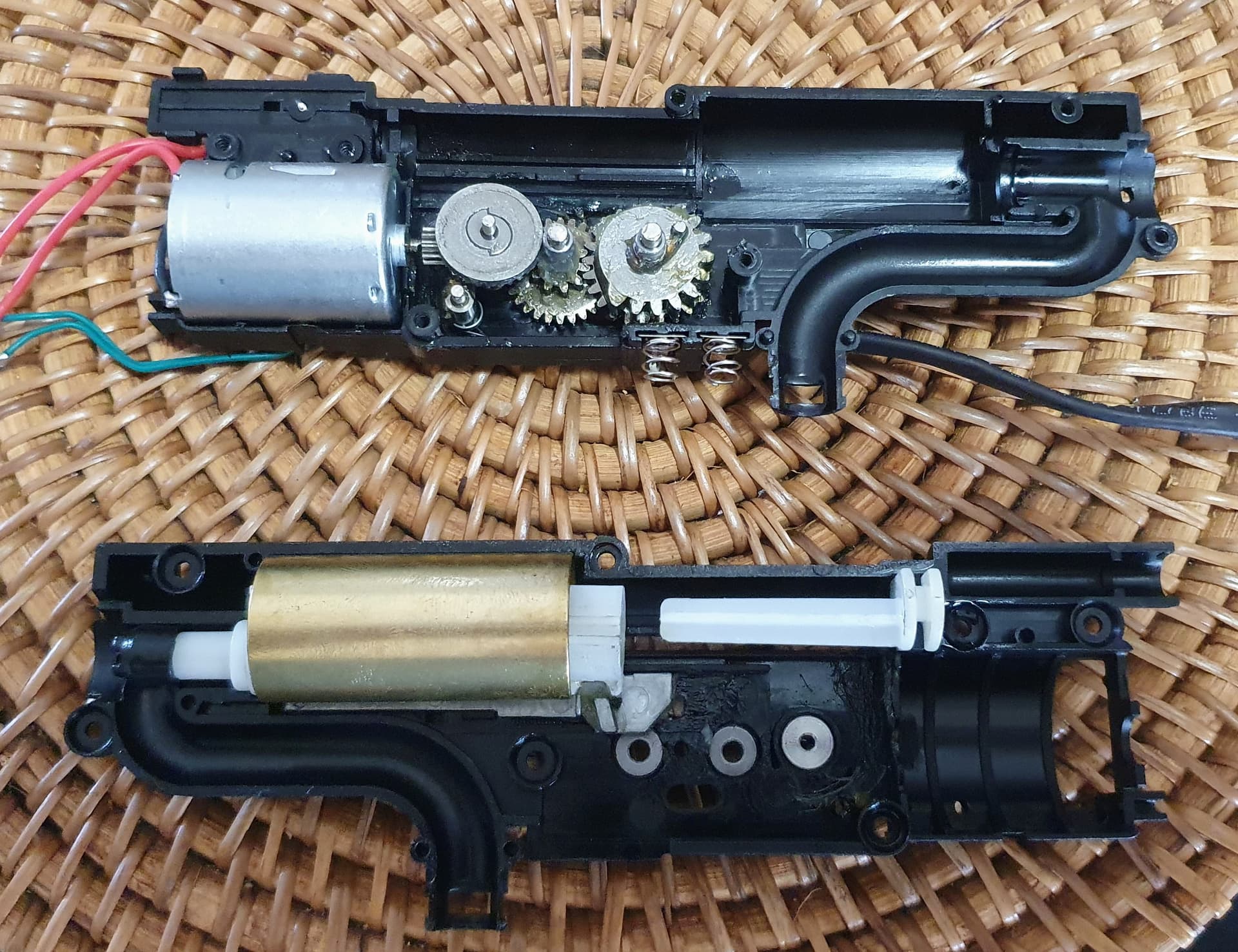 Once it’s apart it’s just another inline box however. Lack of quick change spring release is a pain, although the retainer does locate fairly positively in the shell… and reassembly is frustrating with the a/r latch to keep engaged and the cylinder wanting to pop out under piston spring tension, but not impossible. Went back together with a lot of swearing and very surprised to see metal gears in it, bodes well for FPS upgrades.