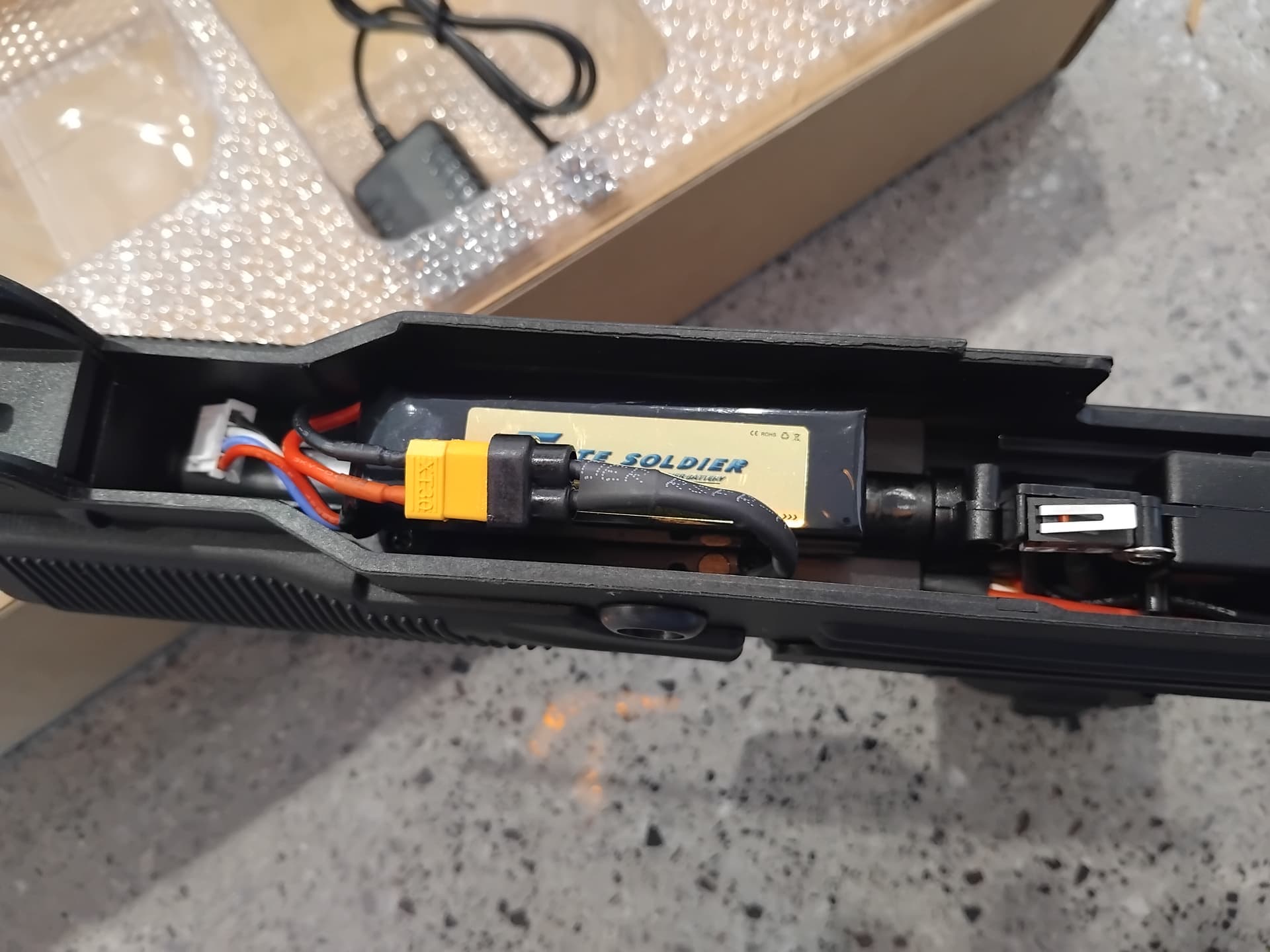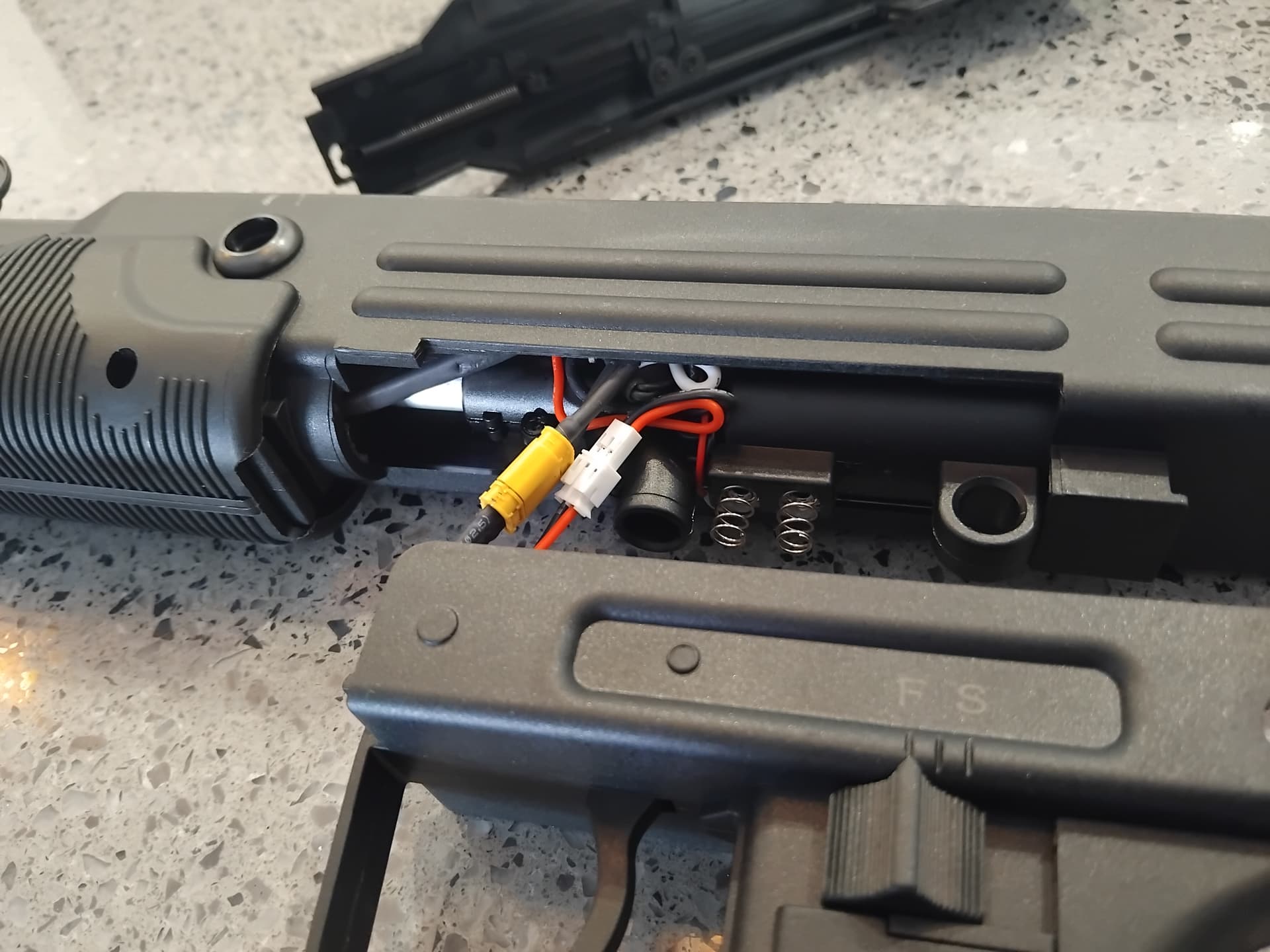 The included battery is XT30, 11v. That gives a ROF of about 1100 r/min… abit high for an uzi.