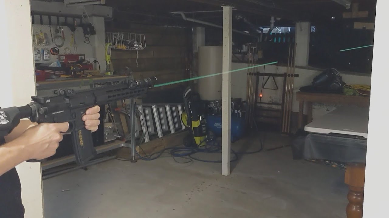 One was simply a couple of UV LED’s drilled and glued into either side of the T-Piece, or a series of the same fitted along the length of the inner hand-guard with a clear plastic barrel, either wired to run off the mag terminal wires to glow when the trigger was pulled.