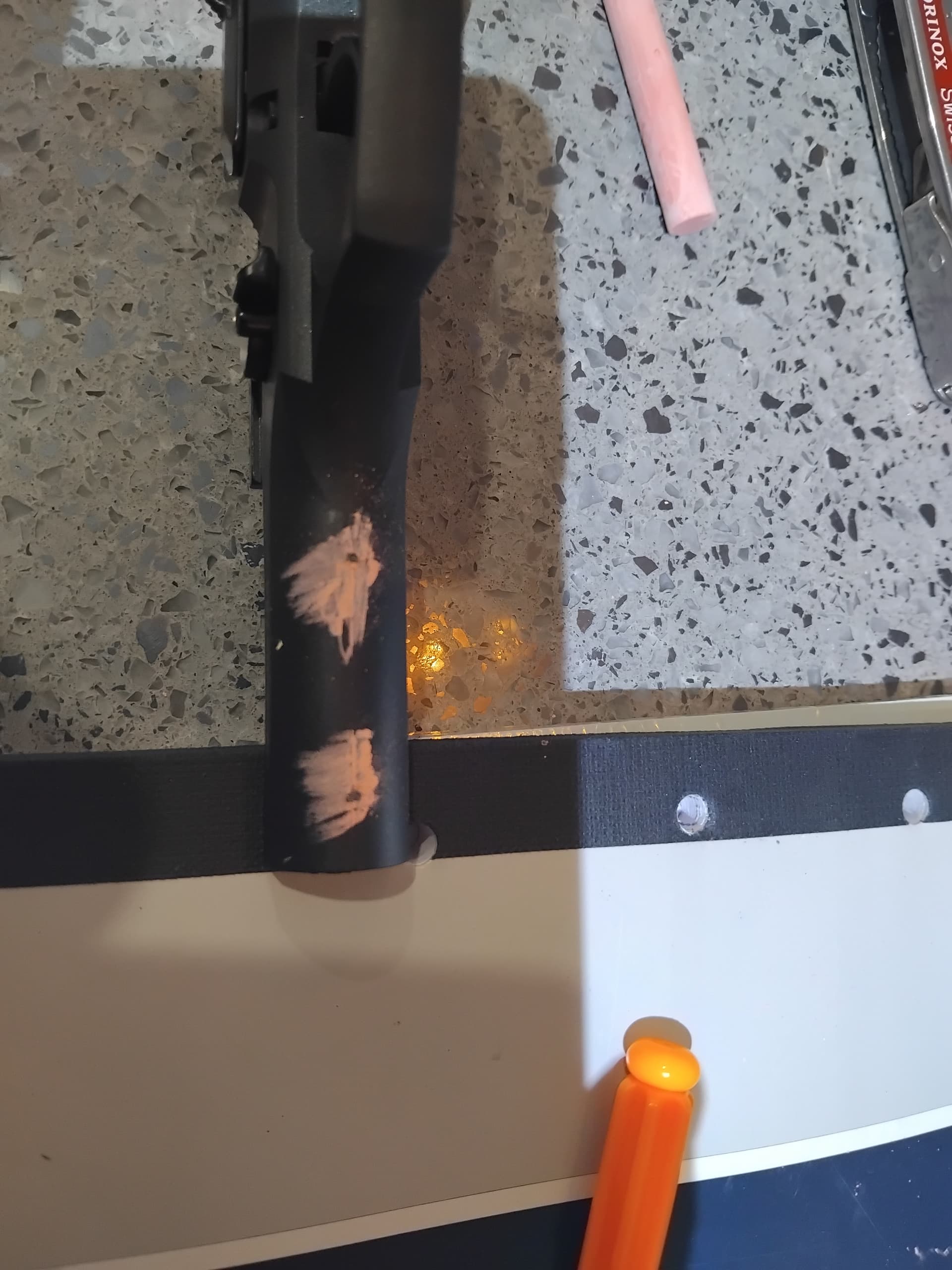 Marked some chalk onto the bottom of the blaster…located, and whacked with a mallet…marks and indentations left behind…enlarge with a holepunch, then drill… ( easy to drill through nylon).