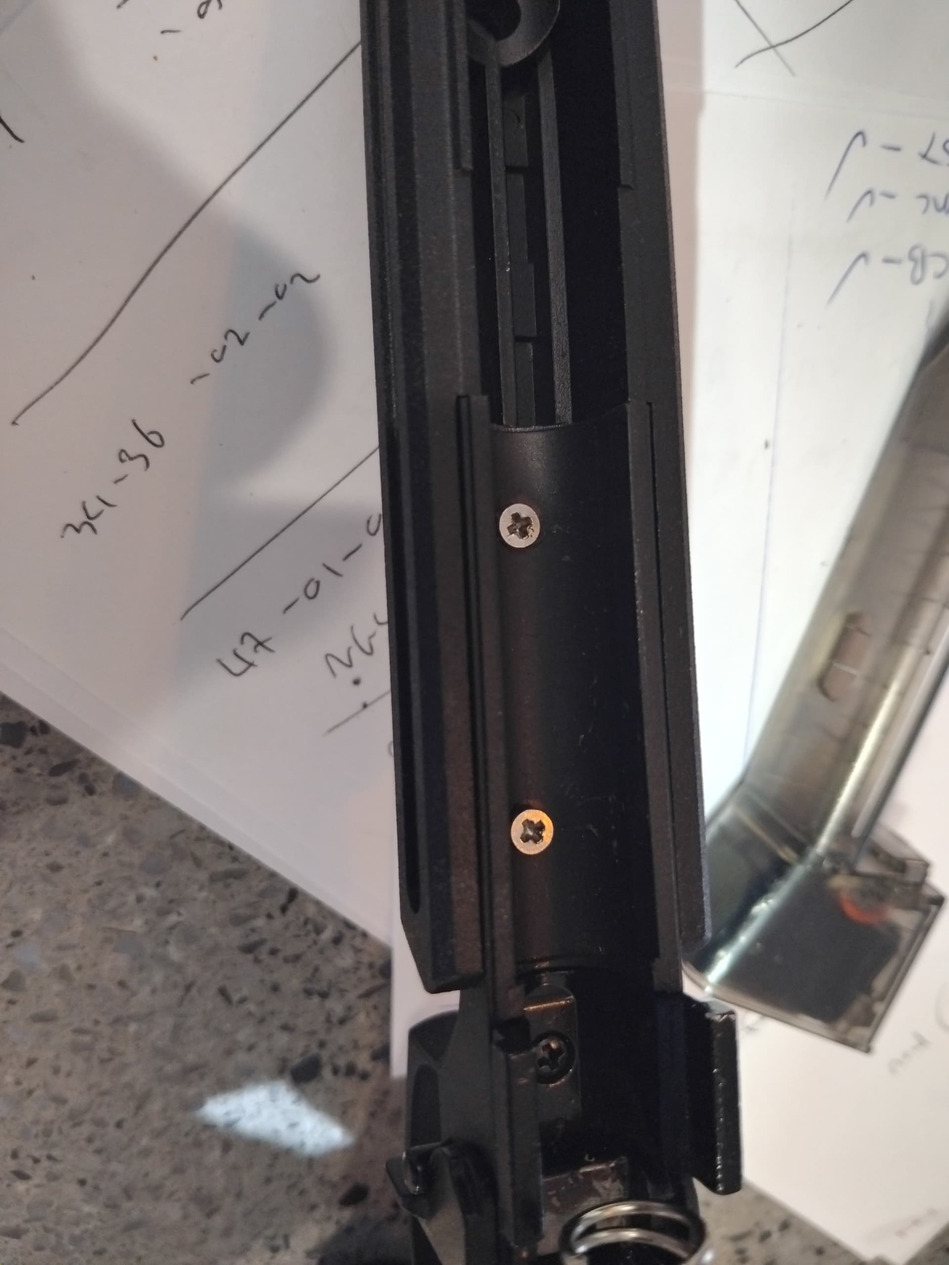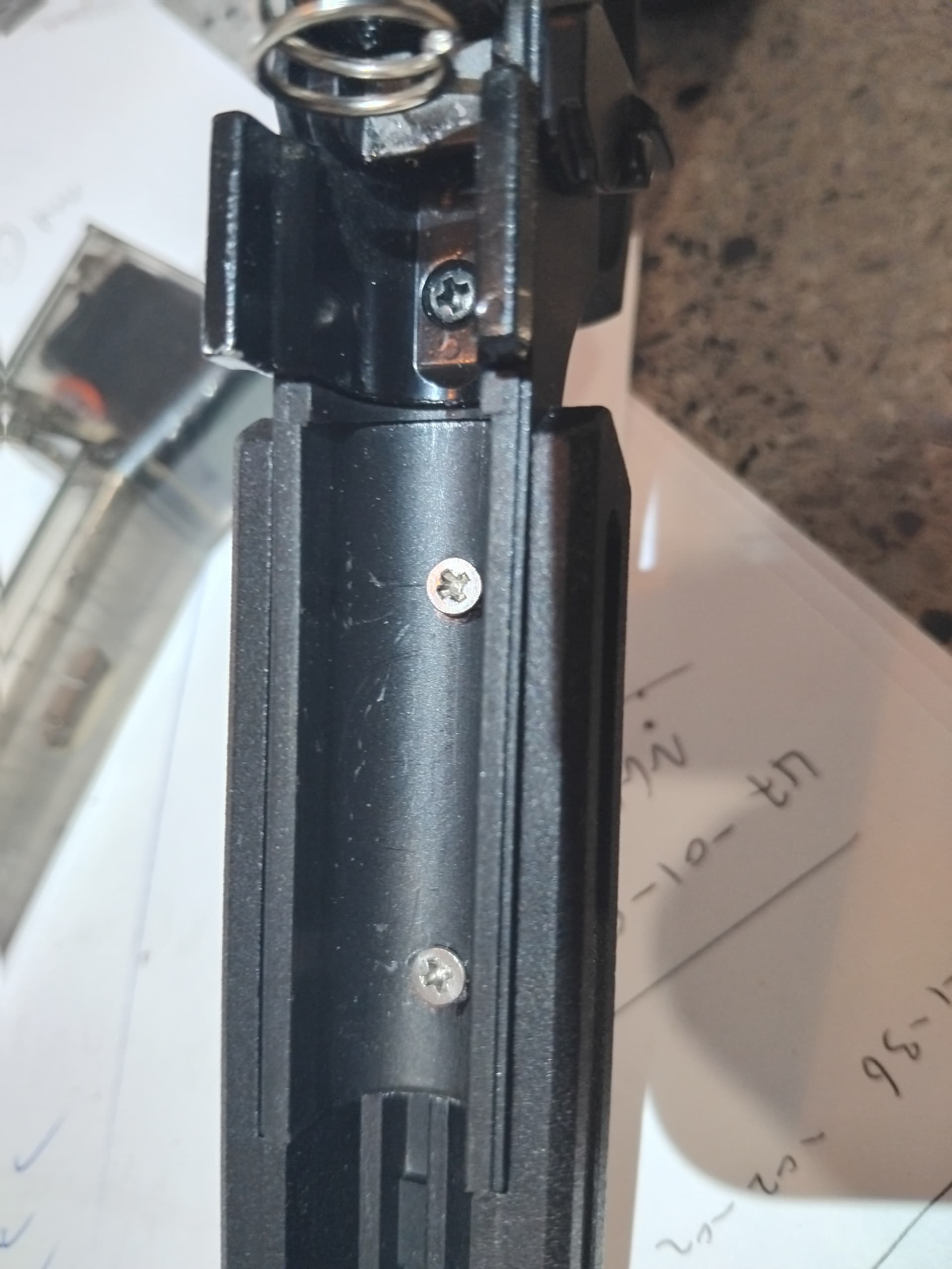 Anyway, the lower rail receives the screws, through the holes in the bottom of the blaster…