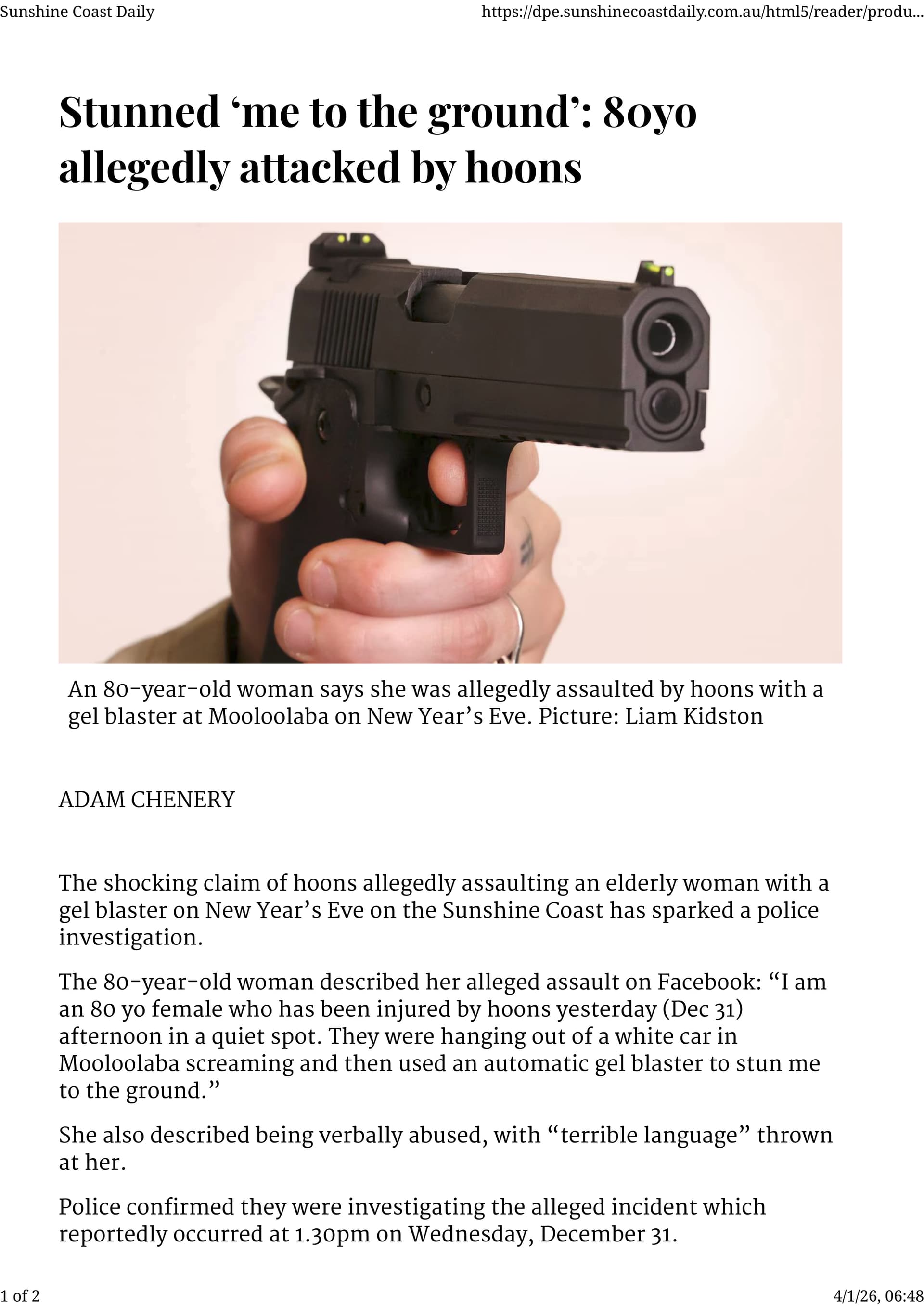 I can’t imagine she was the one to write that post though, what 80yo women knows what an “automatic gel blaster” is, and as BME points out she couldn’t have been stunned by the gels but would have fallen in response to getting hit or seeing them point it at her.