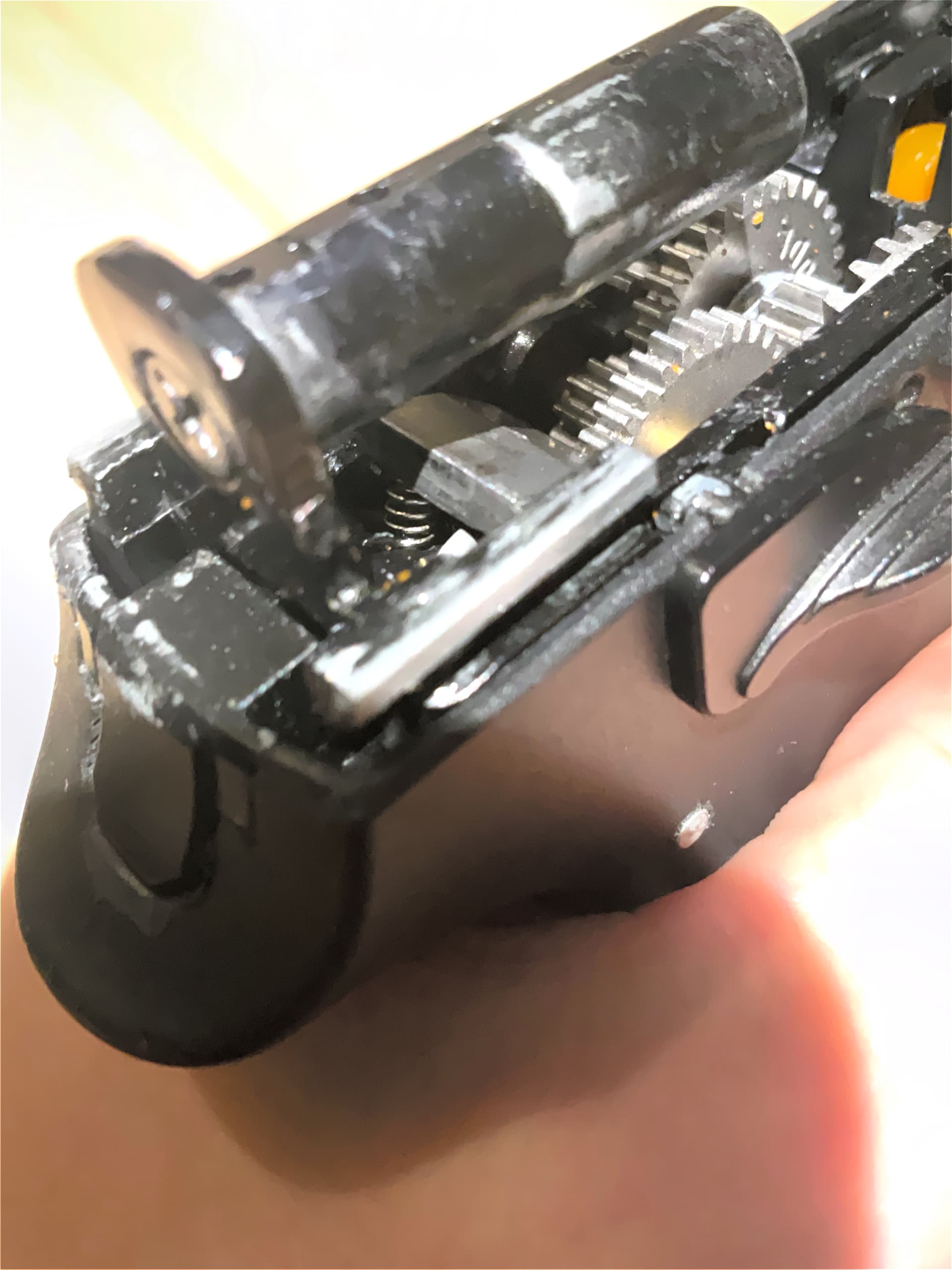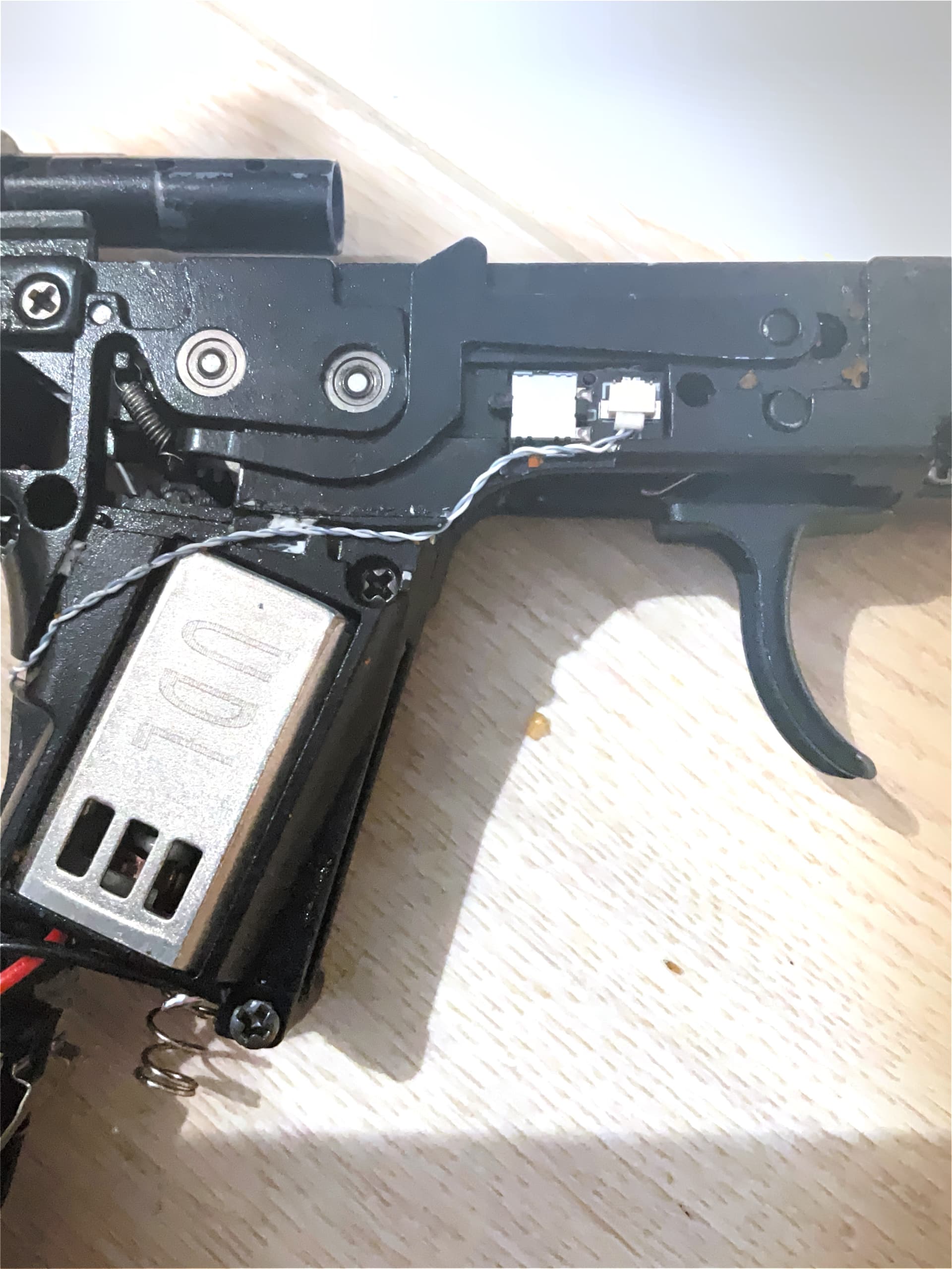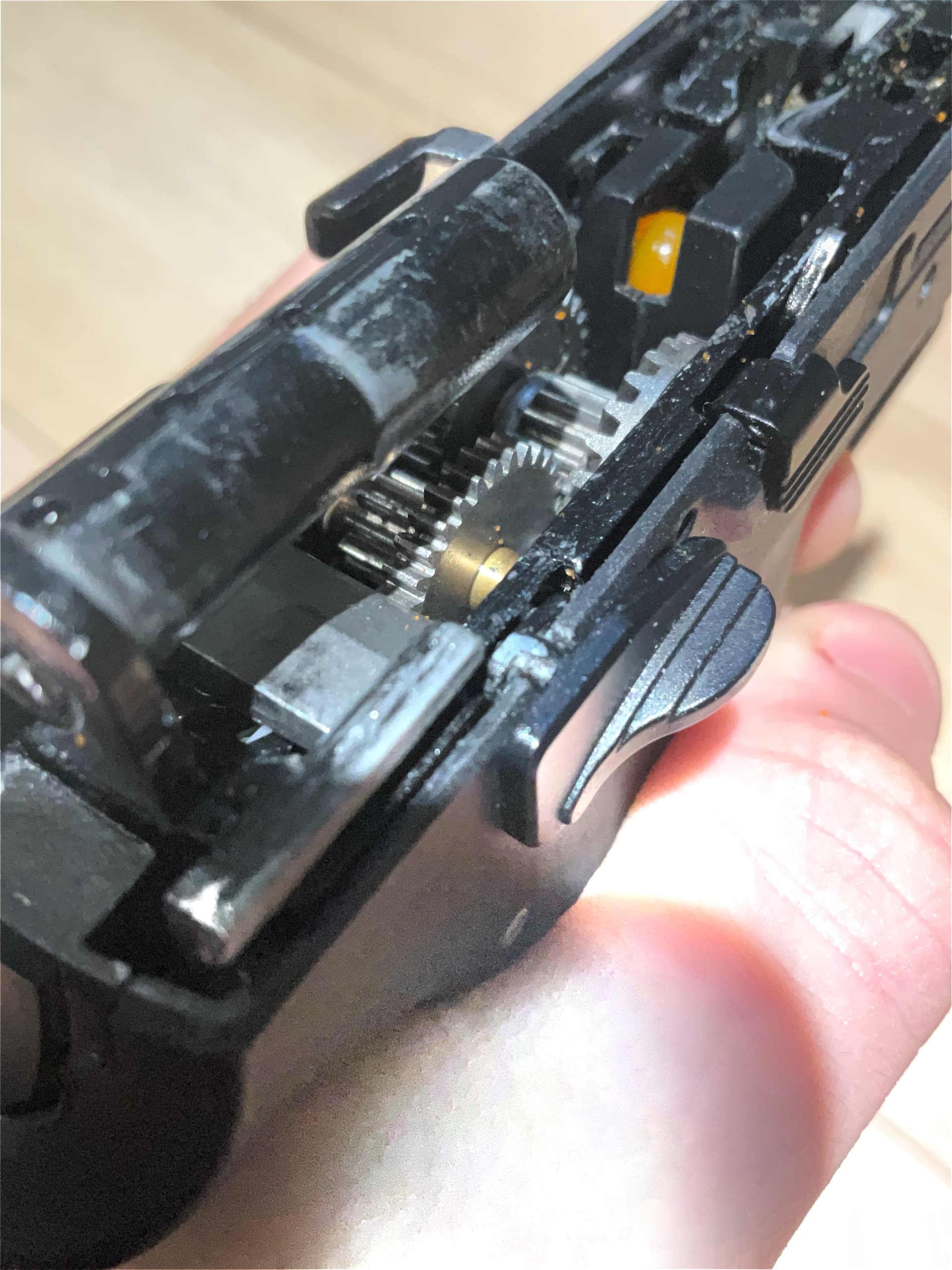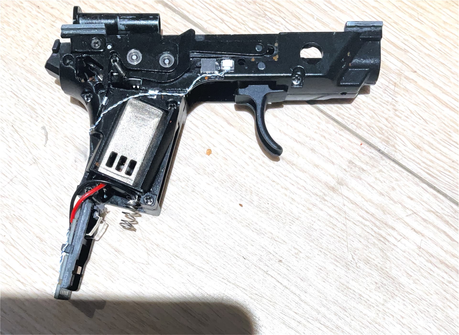 Thanks Rok, I appreciate the advice. After playing around with it a bit more, I think the circuit board is on some sort of timer, so when the trigger is pressed it spins the motor for approximately 0.5-0.8 seconds. In the last two photos, if you look at the edge of the gun, there is a small triangular tab sticking out, right above the metal “button”. This is so that the trigger catch can still catch on the piston while the trigger is pressed. I thought at first it switched off the circuit, but I was wrong. In the 6th photo, under the trigger catch, you’ll see a white thin button. Instead of allowing the electricity flow to the motor, it indicates that the gun has been cocked and therefore allowing the trigger to respond when pressed. In the 7th photo, it shows the button compressed. Photos 10 and 11 show the trigger switch, which allows the electricity to flow to the motor, if the piston has slid over the catch, compressing it. In photos 12 and 13, I just show the circuit board and the full gearbox. Hope this helps!